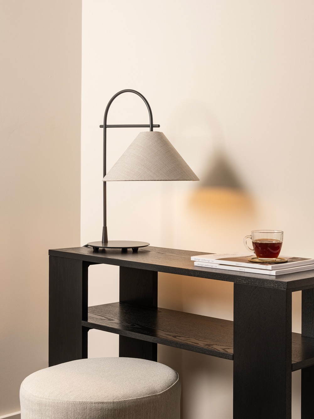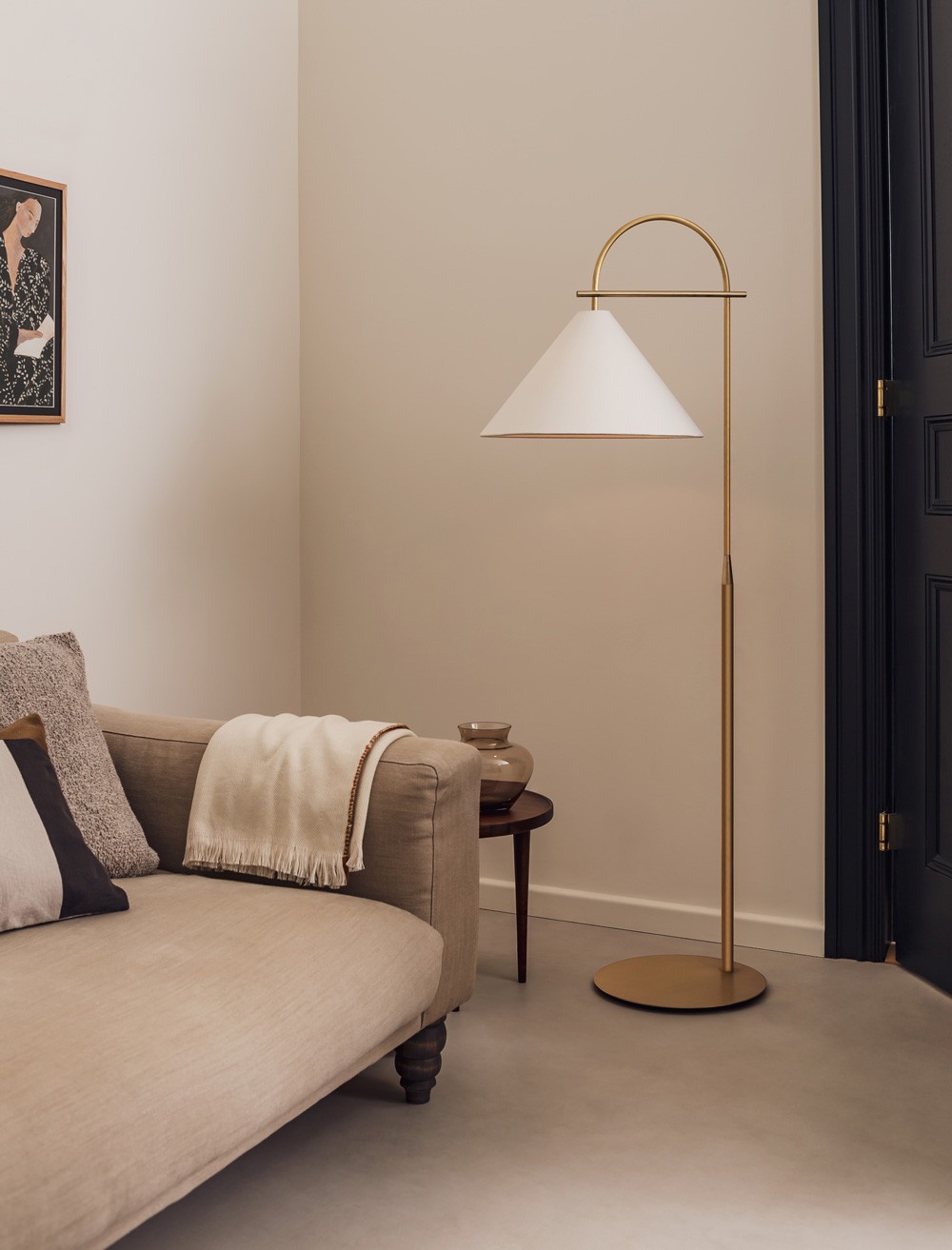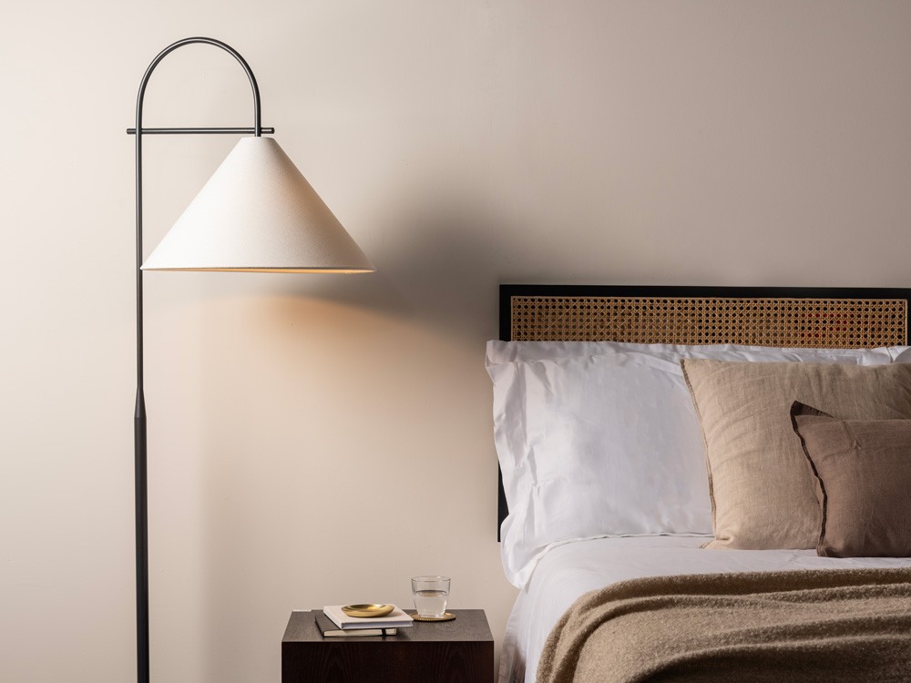 Arlo is a simple, modern lighting collection defined by its arched metalwork and conical shade. Available in Satin Brass or Bronze, the design balances clean lines with a timeless aesthetic.