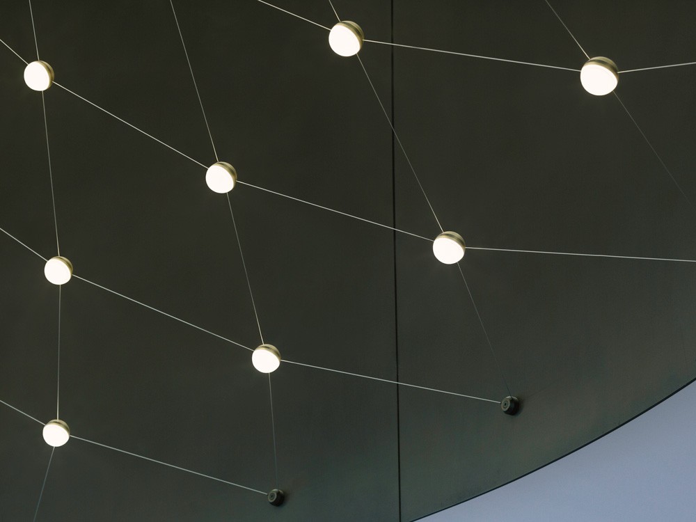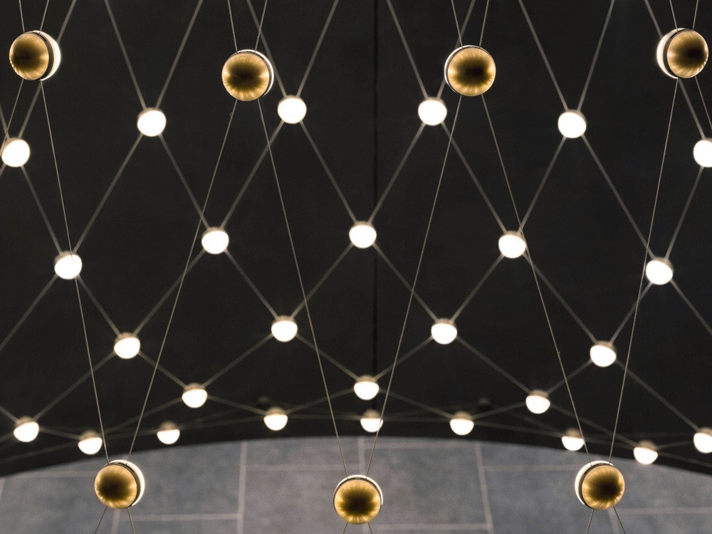 Spanning an oculus void between two floors of the newly developed hub, the installation measures 5 metres in diameter and consists of 242 custom light nodes, suspended and powered through an intricate net of steel cables.