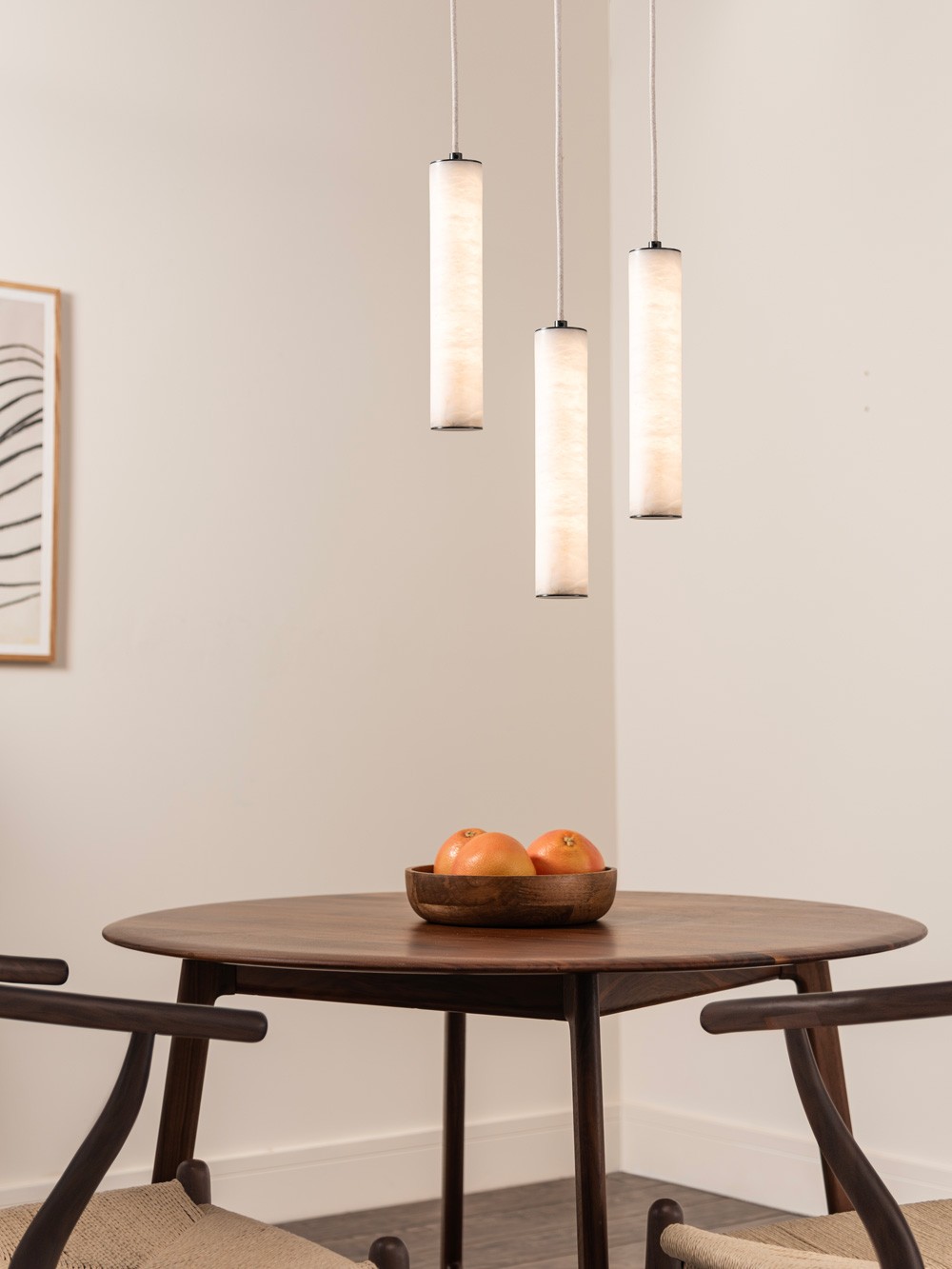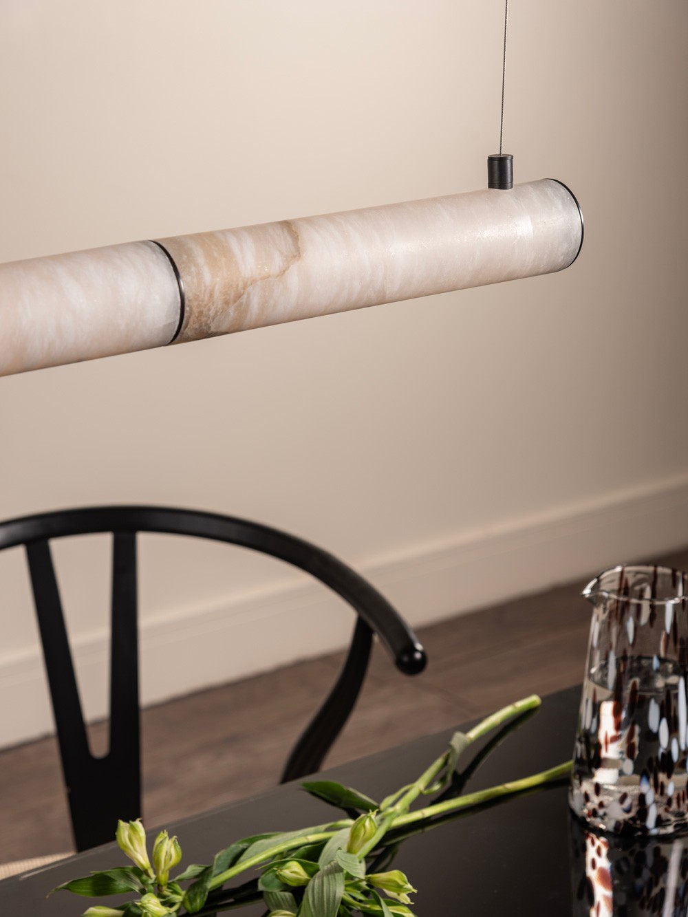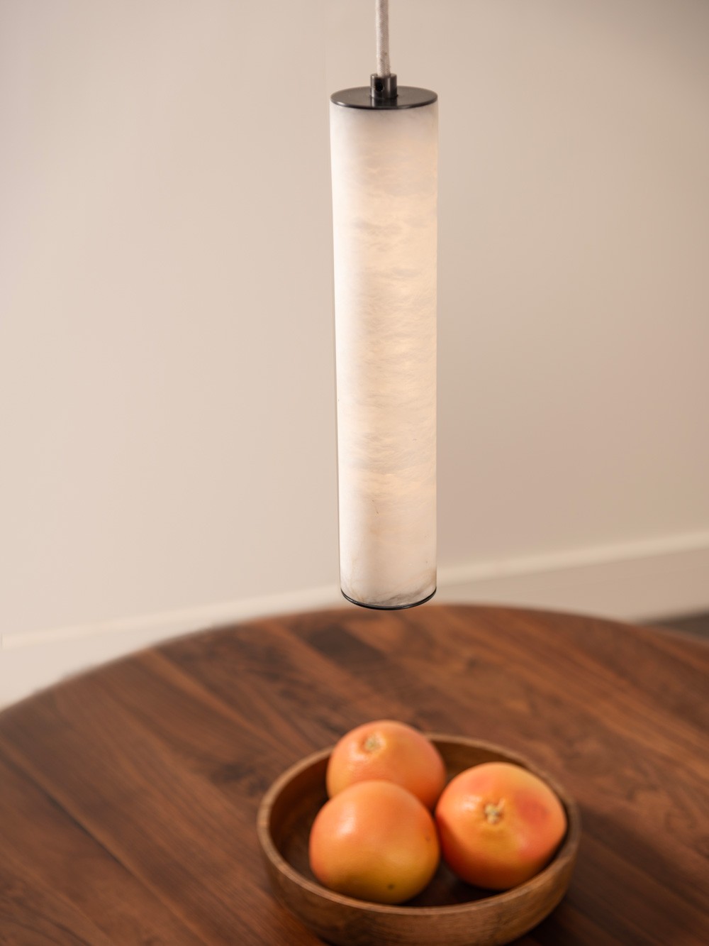 Designed with a simple form, Nula celebrates the natural beauty of alabaster. A solid alabaster tube is lit from within, accentuating the stone’s delicate veining and organic grain. The soft, diffused glow highlights the material’s translucency, adding warmth and depth to the design.